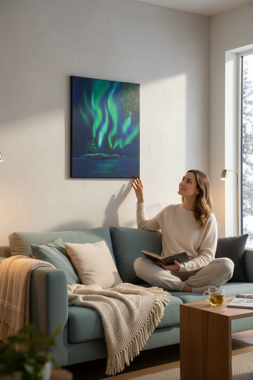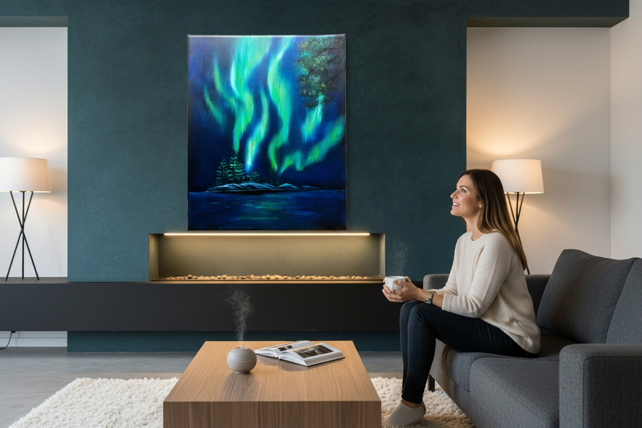 A breathtaking Northern Lights scene painted to honor the quiet beauty of a special island. This custom piece blends vivid aurora ribbons with peaceful waters, creating a window to the night sky wherever it’s placed.